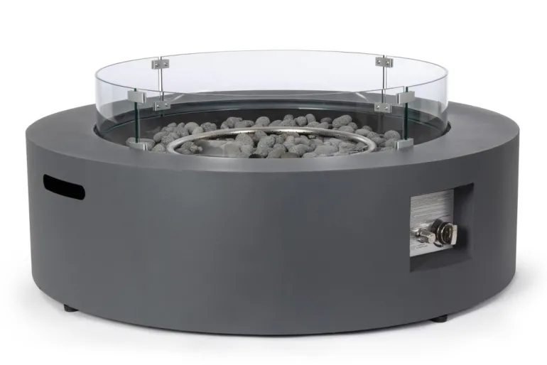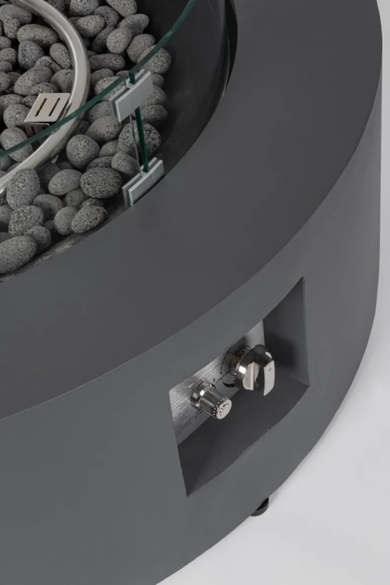 STRUTTURA IN ACCIAIO VERNICIATO (SPESSORE 0,8 MM). PARAVENTO PER CAMINO IN VETRO (SPESSORE 5 MM), VETRO REMOVIBILE. MISURE VETRO Ø74 X 14 CM. BRUCIATORE: Ø45 CM. PROVVISTO DI COPERCHIO IN ACCIAIO VERNICIATO PER COPRIRE L’ARTICOLO QUANDO NON E’ IN USO. COMPLETO DI SASSI DECORATIVI IN ROCCIA LAVICA COLORE GRIGIO SCURO. PROVVISTO DI COPERTURA IN TELO NERO PER COPRIRE