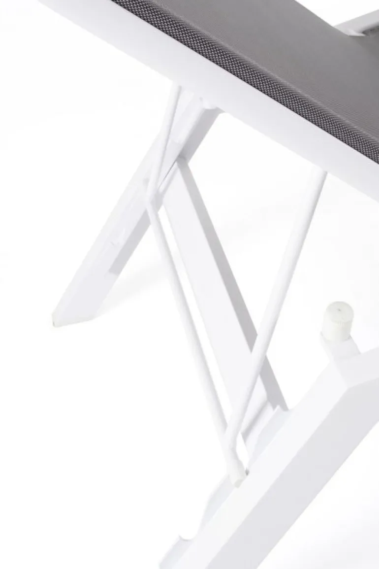 STRUTTURA IN ALLUMINIO VERNICIATA A POLVERE (POLIESTERE). RIVESTIMENTO IN TEXTILENE 1X1. SCHIENALE RECLINABILE IN 3 POSIZIONI. CUSCINO POGGIATESTA CON IMBOTTITURA PER ESTERNO FAST DRY FOAM, REMOVIBILE E SFODERABILE. VITERIA IN ACCIAIO INOSSIDABILE. DA ASSEMBLARE