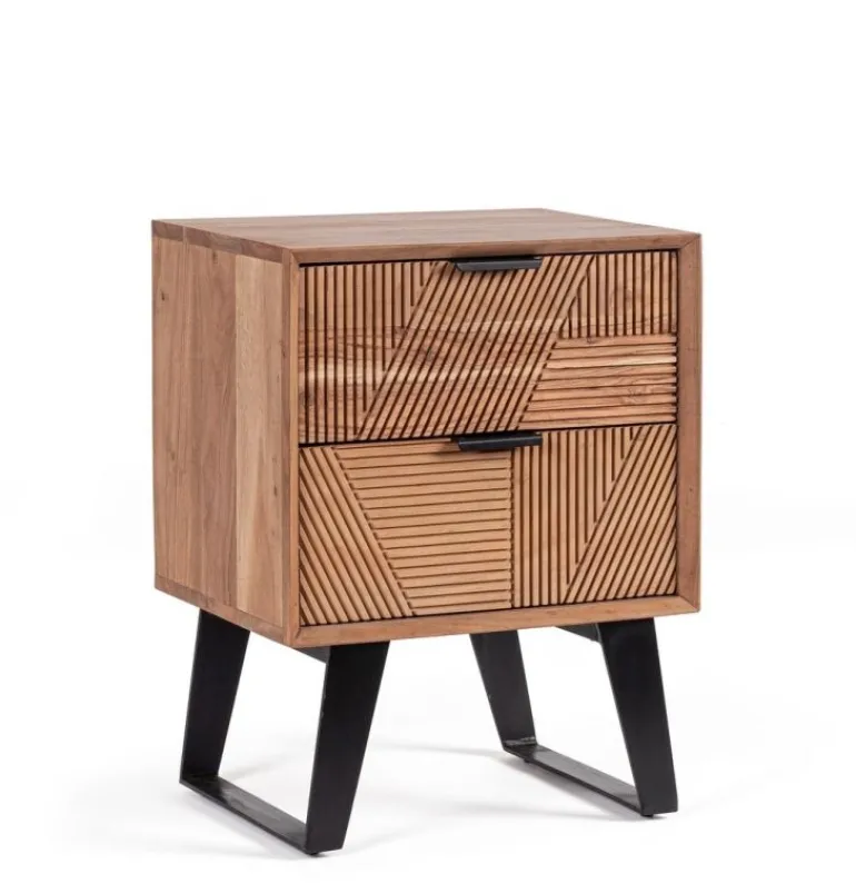 STRUTTURA IN LEGNO DI ACACIA, SCHIENALI E FONDO CASSETTI IN COMPENSATO. FRONTALI CASSETTI INTARSIATI E LAVORATI A MANO. FINITURA ACRILICA PROTETTIVA. MANIGLIE E GAMBE IN ACCIAIO. GAMBE DA ASSEMBLARE.