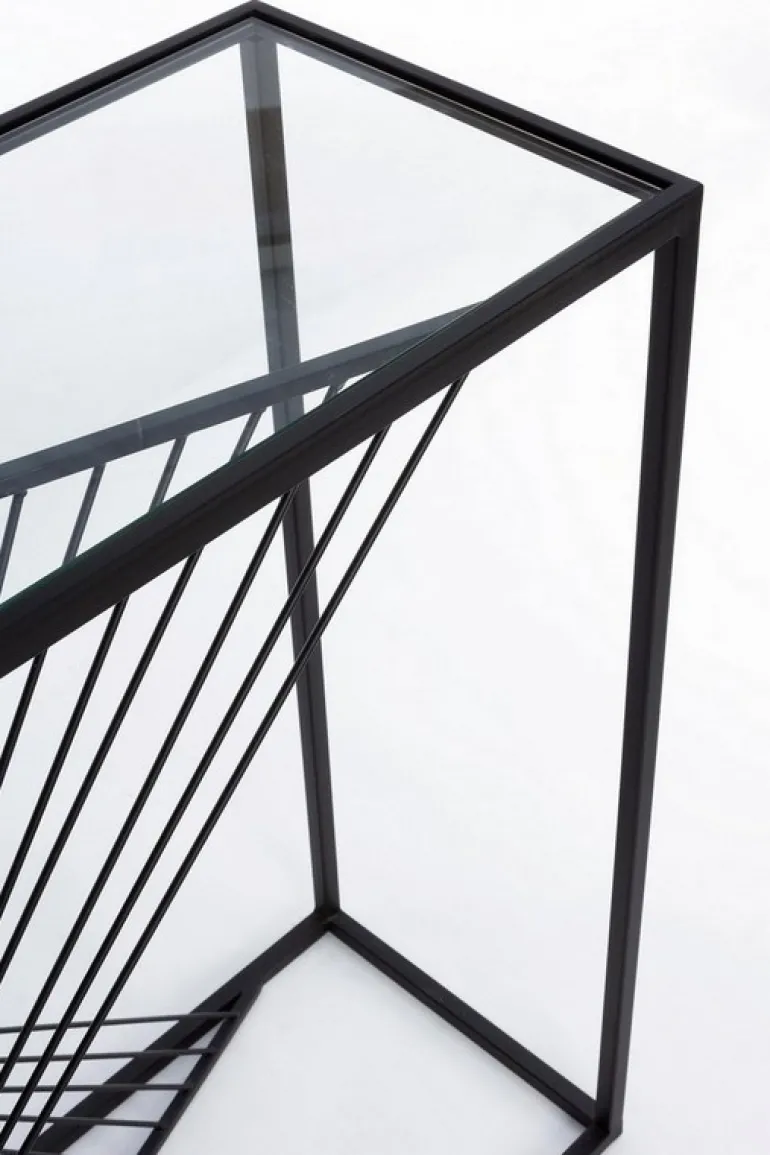 STRUTTURA IN ACCIAIO, VERNICIATA A POLVERE EPOSSIDICA. PIANO IN VETRO TEMPERATO.