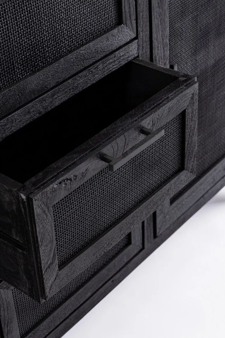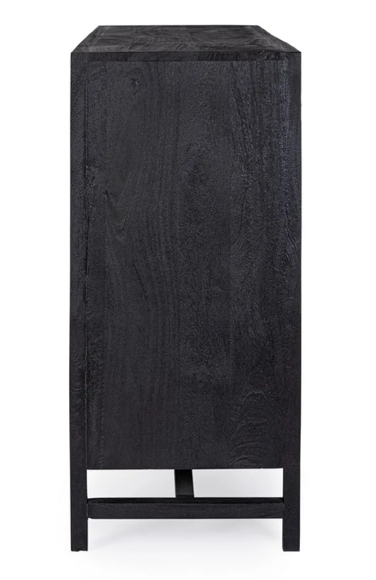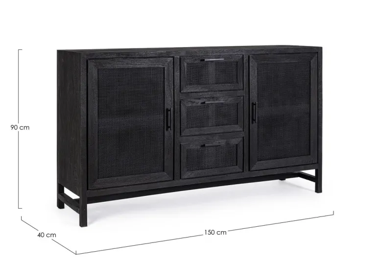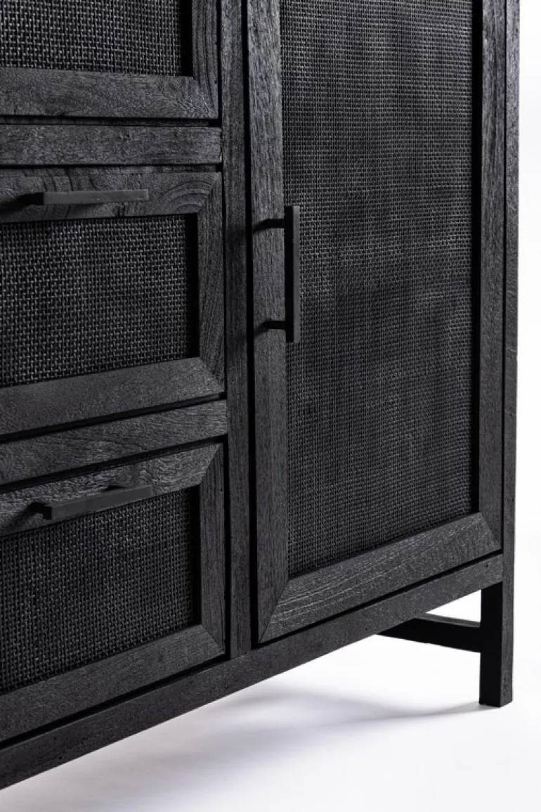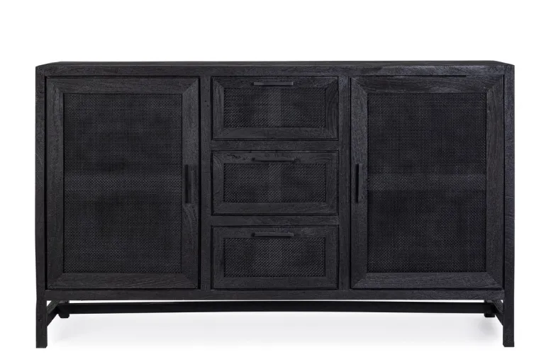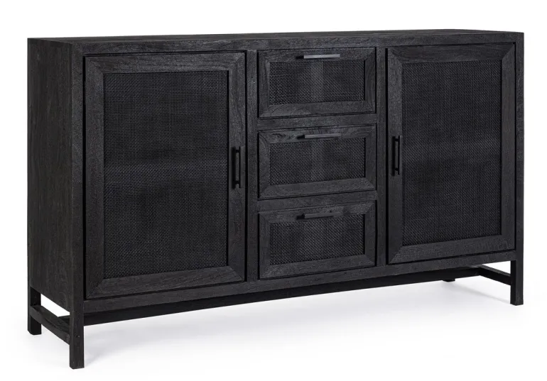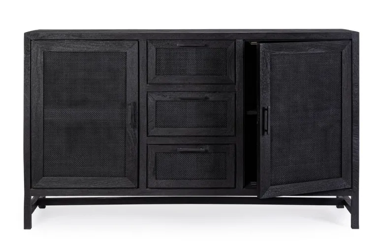 STRUTTURA IN LEGNO DI MANGO CON FINITURA A BASE DI NITROCELLULOSA. SCHIENALE E FONDO CASSETTI IN MDF.ANTE CON INSERTO IN RATTAN