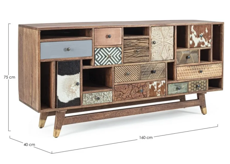 STRUTTURA IN LEGNO DI MANGO, SCHIENALE IN MDF. FRONTALE ANTE E CASSETTI IN LEGNO RICICLATO MANGO ED ACACIA CON APPLICAZIONI IN METALLO E PELLE. STRUTTURA CASSETTI IN MANGO ED ACACIA. FINITURA CON VERNICE A BASE D’ACQUA. MANIGLIE IN ACCIAIO. GAMBE DA ASSEMBLARE.