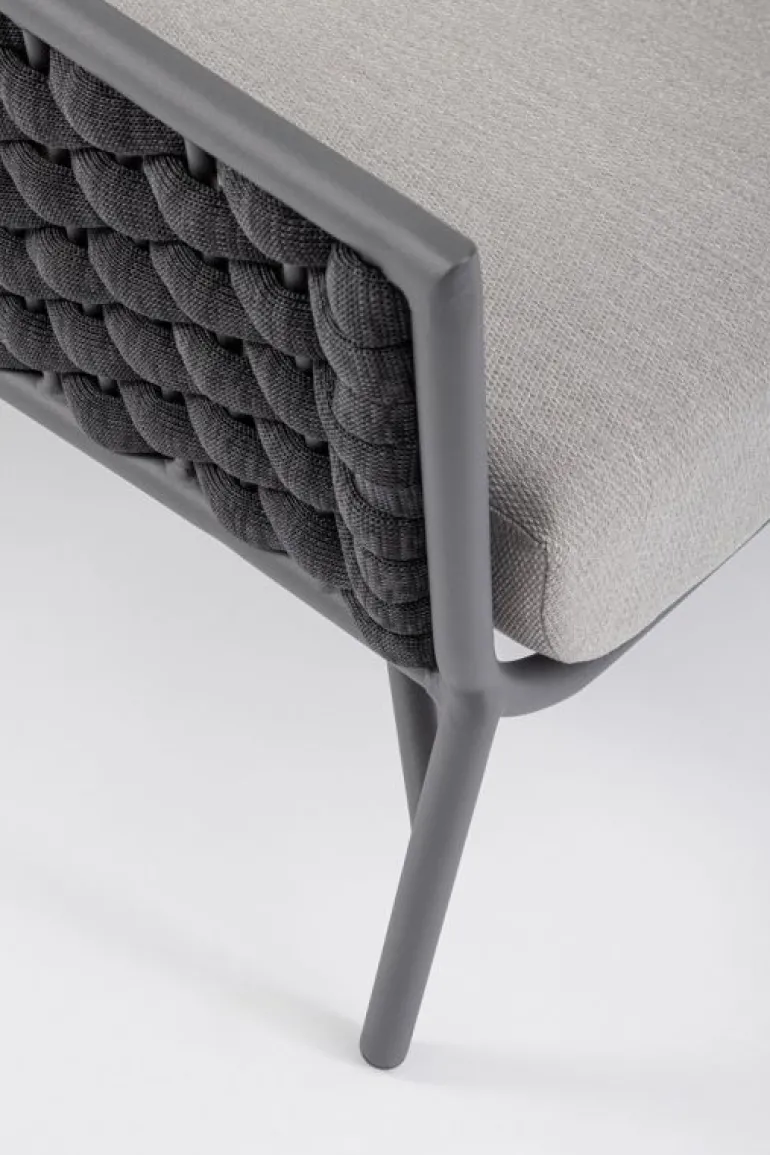 STRUTTURA IN ALLUMINIO VERNICIATO A POLVERE (POLIESTERE). INTRECCIO IN CORDA DI TEXTILENE CON IMBOTTITURA IN GOMMA NITRILICA. CUSCINI SEDUTA E SCHIENALE SFODERABILI IN TESSUTO IDROREPELLENTE OLEFIN (100% POLIPROPILENE).