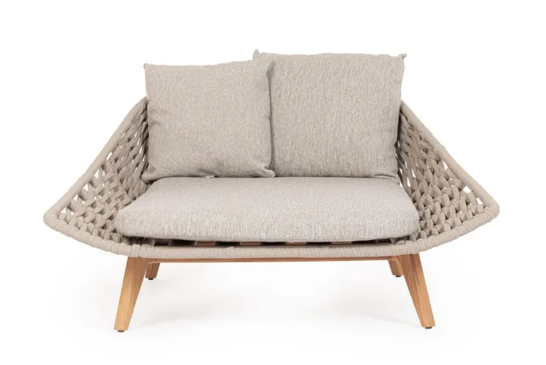 STRUTTURA IN ALLUMINIO VERNICIATA A POLVERE (POLIESTERE). GAMBE IN TEAK – SVLK (LEGNO CERTIFICATO PROVENIENTE DA FORESTE SOSTENIBILI). INTRECCIO PER ESTERNO IN CORDA (POLIPROPILENE). CUSCINI SFODERABILI IN TESSUTO IDROREPELLENTE SUNPROOF OLEFIN (100%POLYPROPYLENE). VITERIA IN ACCIAIO INOSSIDABILE. GAMBE DA ASSEMBLARE.