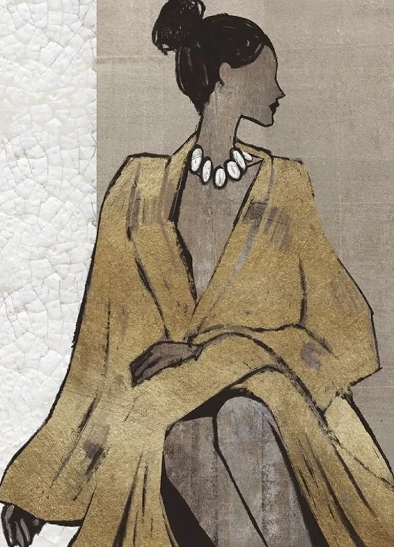 STAMPA SU TELA DIPINTA A MANO CON APPLICAZIONI FOGLI DORATI. CORNICE IN PLASTICA. TELAIO IN LEGNO.