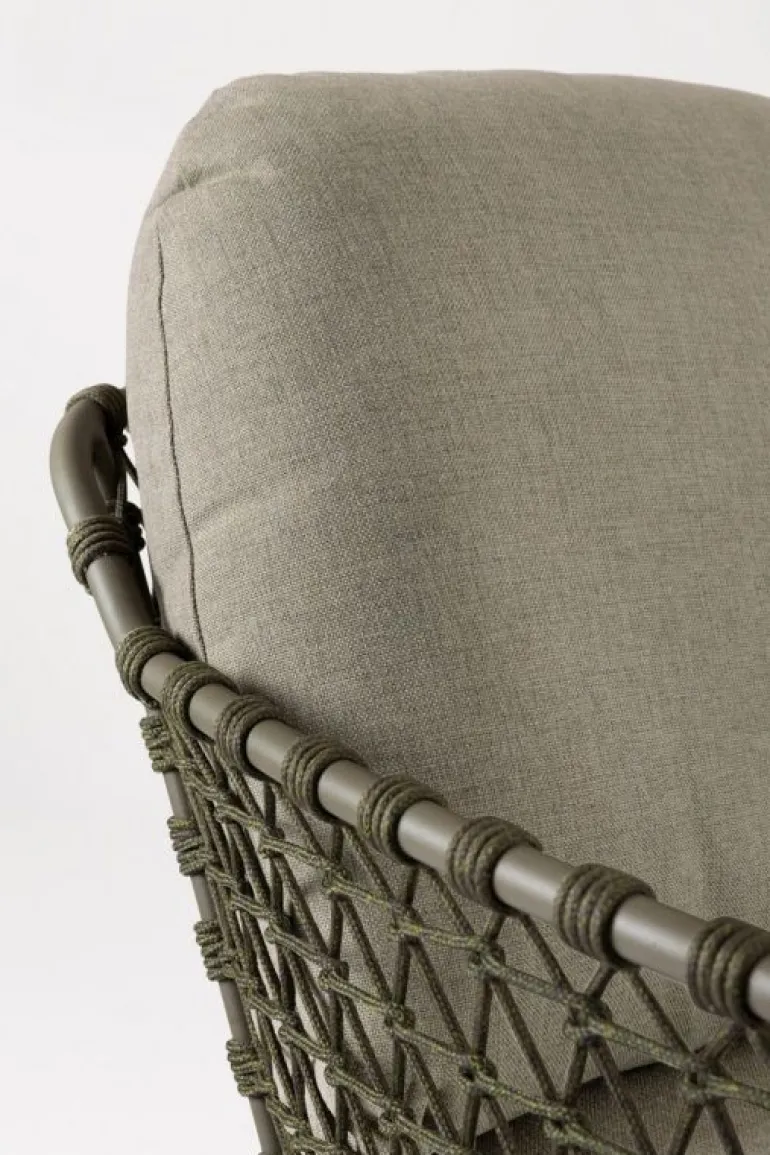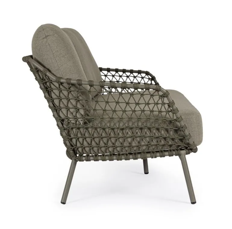 STRUTTURA IN ACCIAIO INOSSIDABILE (201). INTRECCIO PER ESTERNO IN CORDA (POLIPROPILENE). CUSCINI SFODERABILI IN TESSUTO IDROREPELLENTE SUNPROOF OLEFIN (100%POLYPROPYLENE).