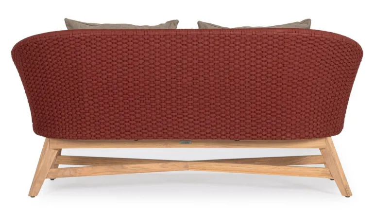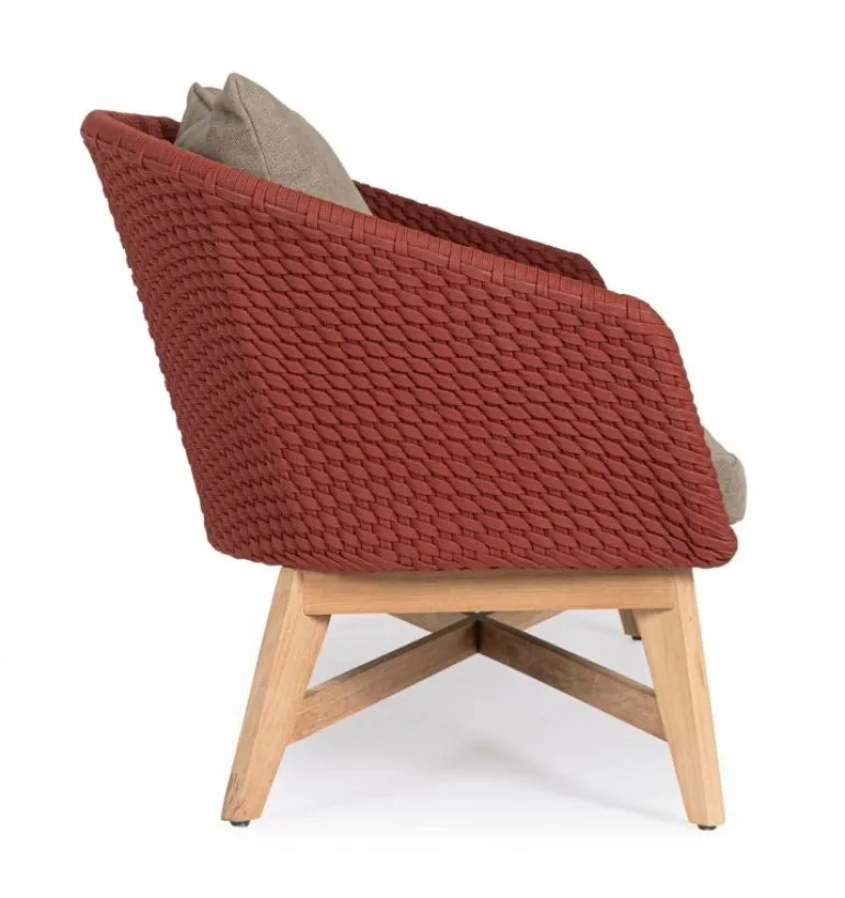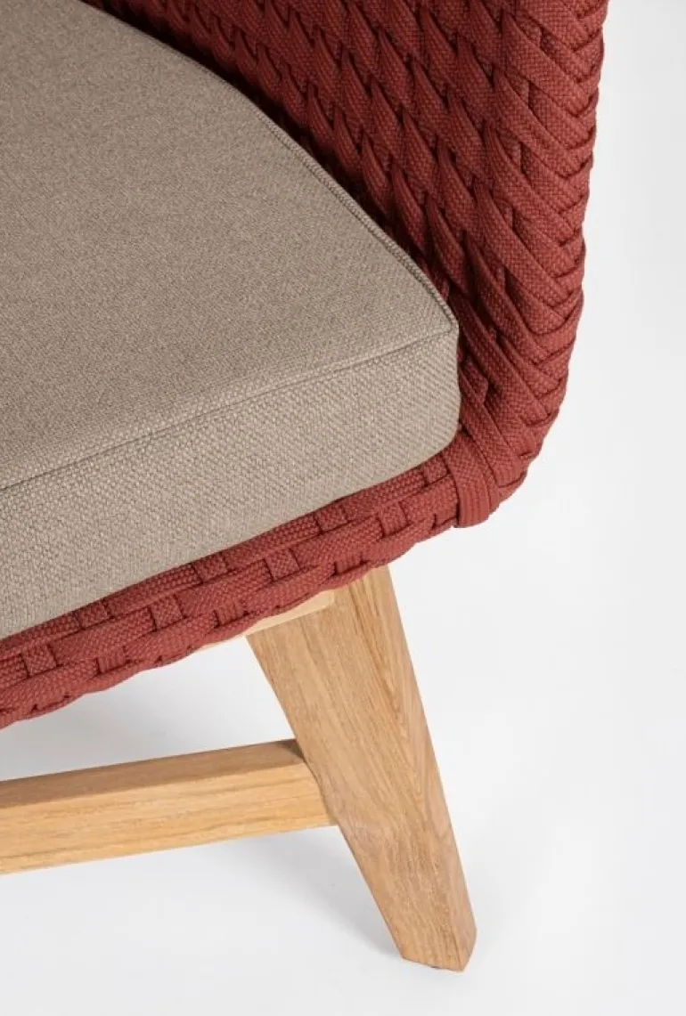 SEDUTA CON STRUTTURA IN ALLUMINIO VERNICIATA A POLVERE (POLIESTERE). INTRECCIO IN CORDA OLEFIN (100% POLIPROPILENE). CUSCINO SEDUTA E SCHIENALE SFODERABILE IN TESSUTO IDROREPELLENTE SUNPROOF OLEFIN (100% POLIPROPILENE). GAMBE IN TEAK – SVLK (LEGNO CERTIFICATO PROVENIENTE DA FORESTE SOSTENIBILI). VITERIA IN ACCIAIO GALVANIZZATO. GAMBE DA ASSEMBLARE. ATTENZIONE: PRIMA DI PROCEDERE AL MONTAGGIO, ASSICURARSI CHE LA NUMERAZIONE SEDUTA-GAMBE COINCIDA.