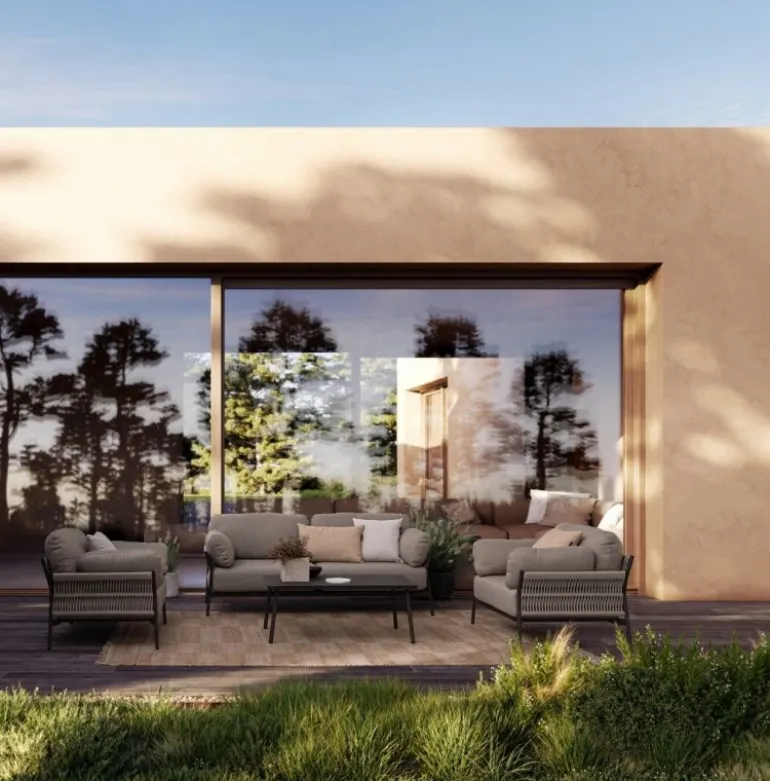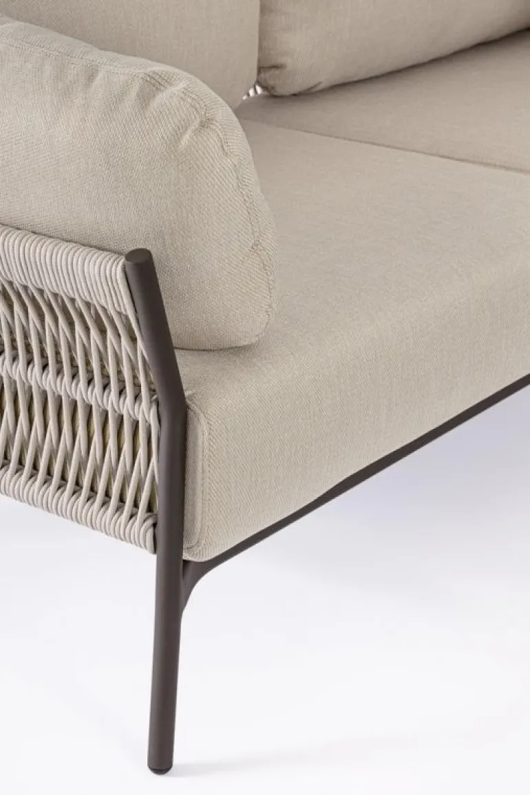 STRUTTURA IN ALLUMINIO VERNICIATO A POLVERE (POLIESTERE). INTRECCIO IN CORDA OLEFIN (100% POLIPROPILENE). CUSCINI SEDUTA E SCHIENALE SFODERABILI IN TESSUTO IDROREPELLENTE OLEFIN (100% POLIPROPILENE).