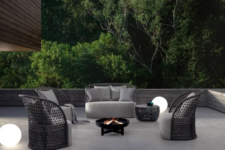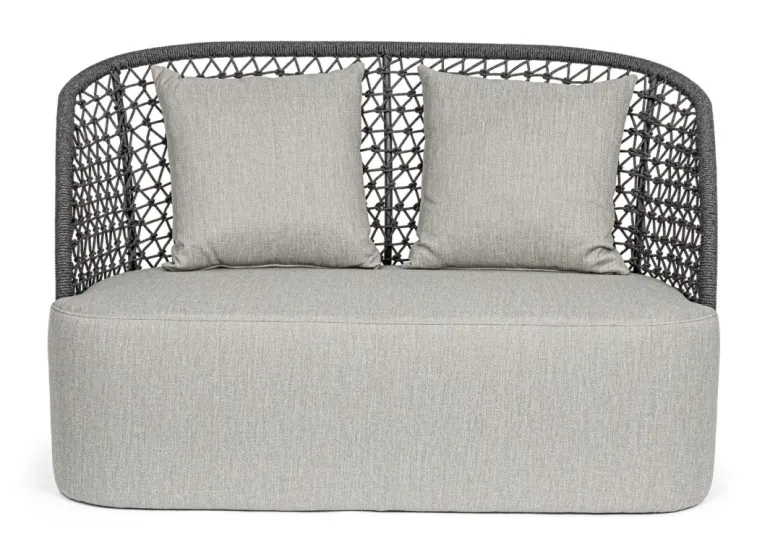 STRUTTURA IN ALLUMINIO VERNICIATO A POLVERE (POLIESTERE), INTRECCIO CON CORDA IN OLEFIN (100% POLIPROPILENE). SEDUTA CON IMBOTTITURA IMPERMEABILIZZATA, RIVESTIMENTO NON SFODERABILE IN TESSUTO PER ESTERNO IN OLEFIN (100% POLIPROPILENE, 285G/M2),IDROREPELLENTE E RESISTENTE AI RAGGI UV (GRADO 7). CUSCINO SCHIENALE SFODERABILE IN