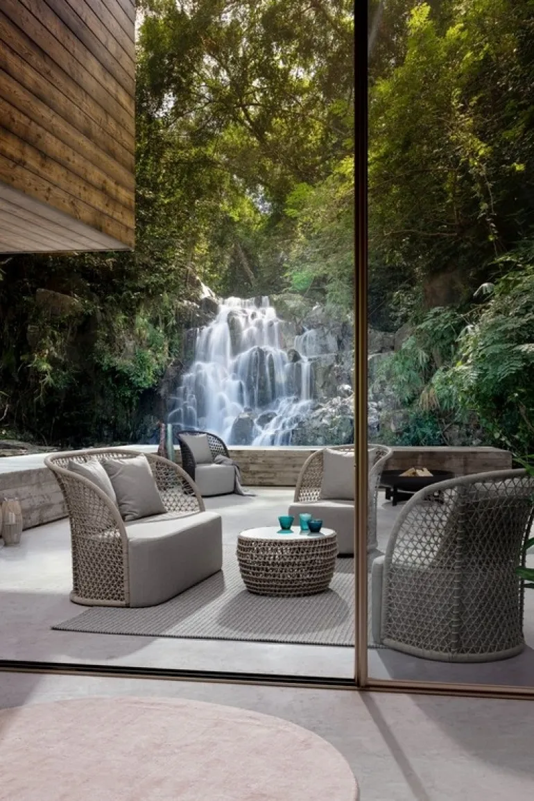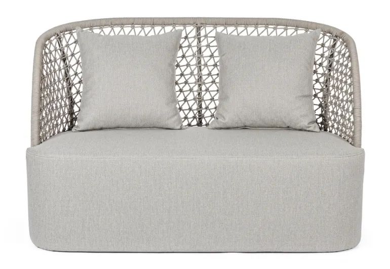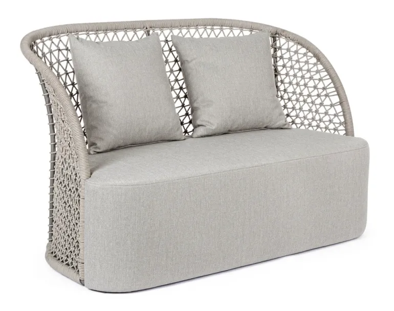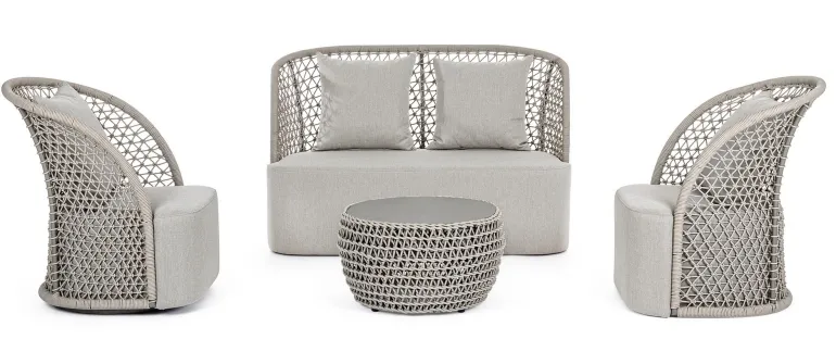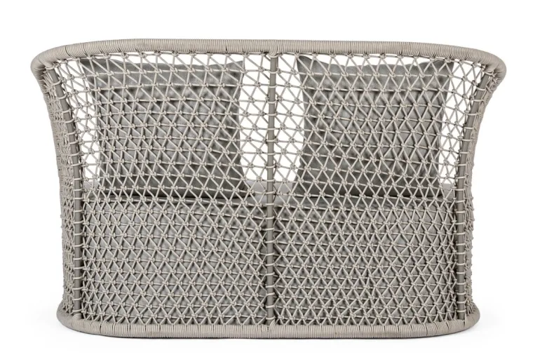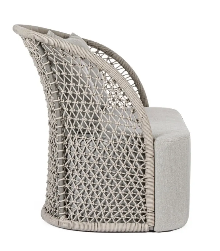 STRUTTURA IN ALLUMINIO VERNICIATO A POLVERE (POLIESTERE), INTRECCIO CON CORDA IN OLEFIN (100% POLIPROPILENE). SEDUTA CON IMBOTTITURA IMPERMEABILIZZATA, RIVESTIMENTO NON SFODERABILE CON TESSUTO PER ESTERNO IN OLEFIN (100% POLIPROPILENE, 285G/M2),IDROREPELLENTE E RESISTENTE AI RAGGI UV (GRADO 7). CUSCINO SCHIENALE SFODERABILE CON