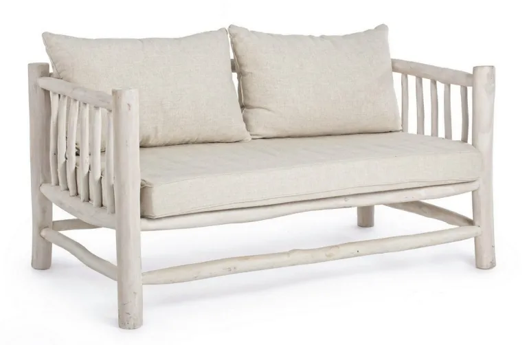 RAMI DI TEAK SBIANCATO CON FINITURA A BASE DI NITROCELLULOSA. CUSCINI SFODERABILI CON TESSUTO PER INTERNO (40% LINO, 60% COTONE). SOLO PER USO INTERNO. IMBALLO SENZA CARTONE.
