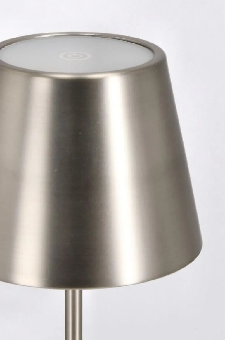 METALLO TRATTATO CON ELETTROPLACCATURA, LAMPADA LED, BATTERIA RICARICABILE CON CAVO USB 1 MT INCLUSO. TASTO ON/OFF TOUCH. PER USO INTERNO ED ESTERNO, IP54.