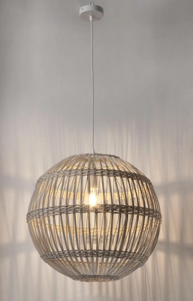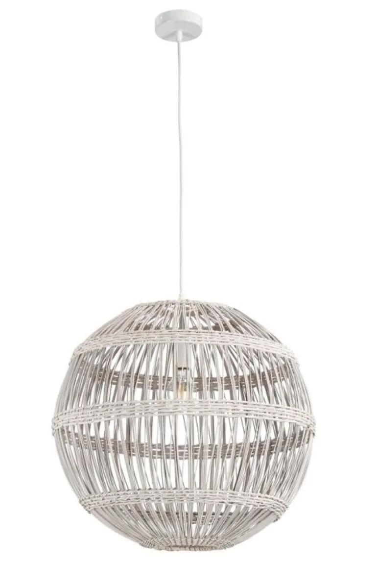 METALLO E RATTAN. E27 MAX 40W, E27 8-11W COMPATTA FLUORESCENTE INTEGRATA A RISPARMIO ENERGETICO O E27 28W ALOGENA A RISPAMIO ENERGETICO. LAMPADINA NON INCLUSA. LUNGHEZZA TOTALE CAVO 0.8 MT. PORTALAMPADA E CAVO: COLORE BIANCO. IP 20.