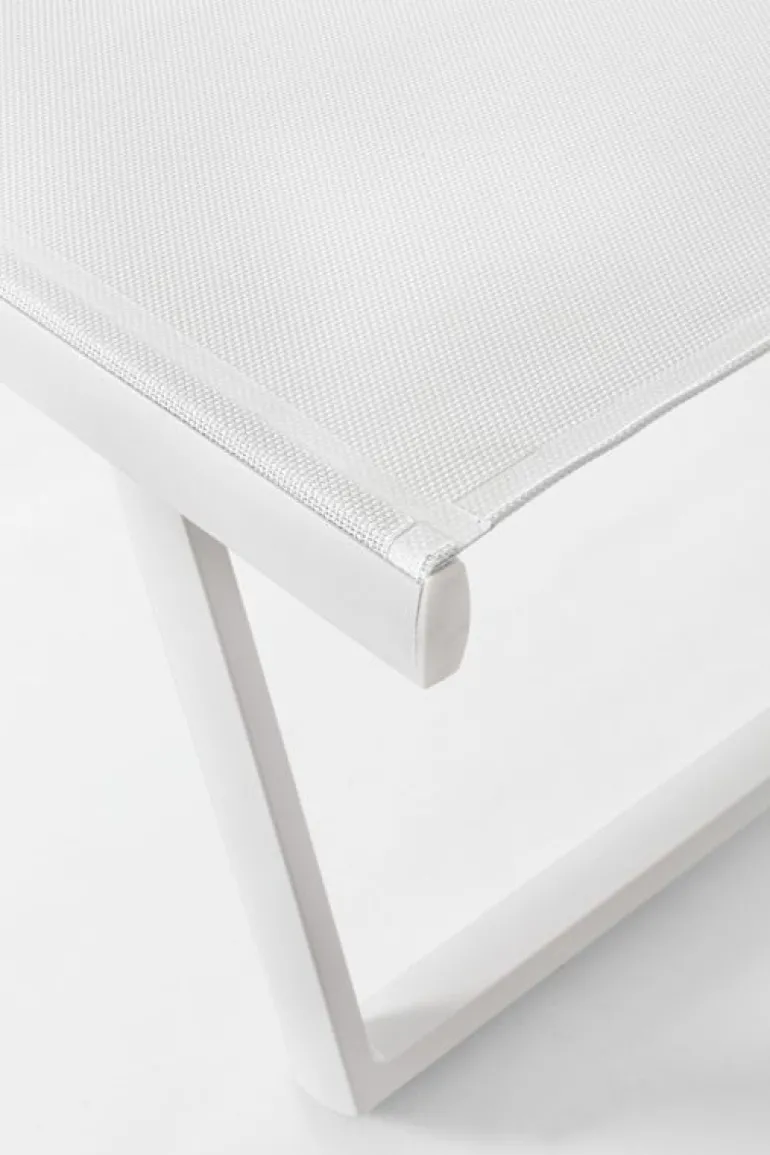 STRUTTURA IN ALLUMINIO, VERNICIATO A POLVERE (POLIESTERE). SEDUTA E SCHIENALE RIVESTITI IN TEXTILENE 2X1 (610G/M2). SCHIENALE RECLINABILE (4 POSIZIONI). VITERIA IN ACCIAIO GALVANIZZATO. RUOTE DA ASSEMBLARE IN PLASTICA (PU).
