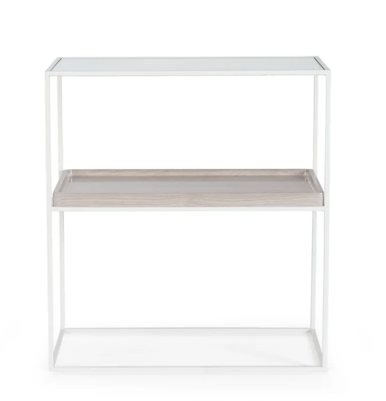 STRUTTURA IN ACCIAIO VERNICIATO A POLVERE EPOSSIDICA. PIANO SUPERIORE IN VETRO TEMPERATO, PIANO INFERIORE IN MDF IMPIALLACCIATO PVC.
