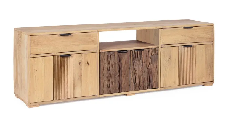 STRUTTURA IN LEGNO MANGO, SCHIENALE IN COMPENSATO. FRONTALE ANTE IN LEGNO DI MANGO O RICICLATO. FINITURA ACRILICA PROTETTIVA. MANIGLIE IN METALLO. IL PRODOTTO IN LEGNO RICICLATO È CARATTERIZZATO DALLA PRESENZA DI TASSELLI IN LEGNO DI DIVERSE SPECIE E COLORE. EVENTUALI FESSURE, CREPE O IMPERFEZIONI, CHE POSSONO GENERARSI ANCHE NEL CORSO DEL TEMPO, SONO CARATTERISTICHE DI QUESTO MATERIALE E RENDONO OGNI PEZZO UNICO E ORIGINALE.