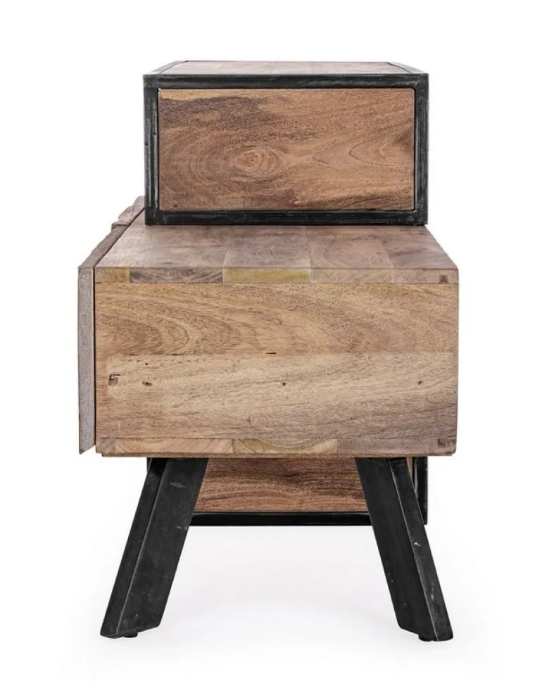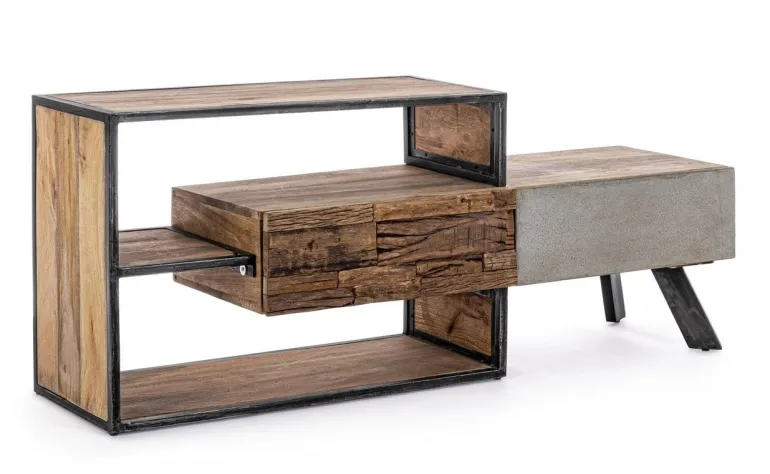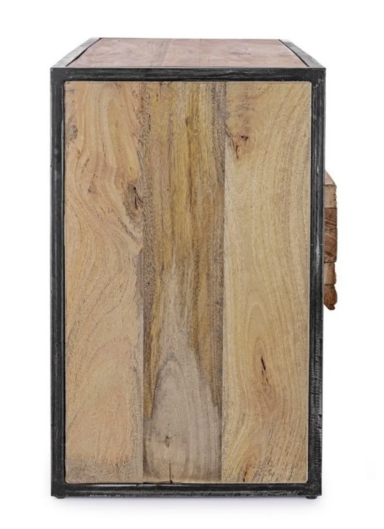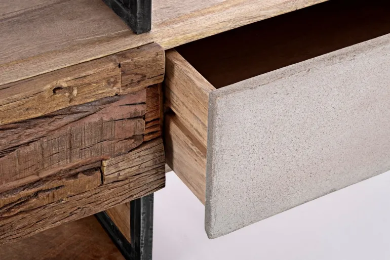 STRUTTURA IN LEGNO MANGO ED ACCIAIO, SCHIENALE IN COMPENSATO. FRONTALE ANTE E CASSETTI IN LEGNO RICICLATO O LAMINA DI ACCIAIO O FINITURA IN FIBRA DI CEMENTO. FINITURA ACRILICA PROTETTIVA. PIEDINI REGOLABILI. IL PRODOTTO IN LEGNO RICICLATO È CARATTERIZZATO DALLA PRESENZA DI TASSELLI IN LEGNO DI DIVERSE SPECIE E COLORE. EVENTUALI FESSURE, CREPE O IMPERFEZIONI, CHE POSSONO