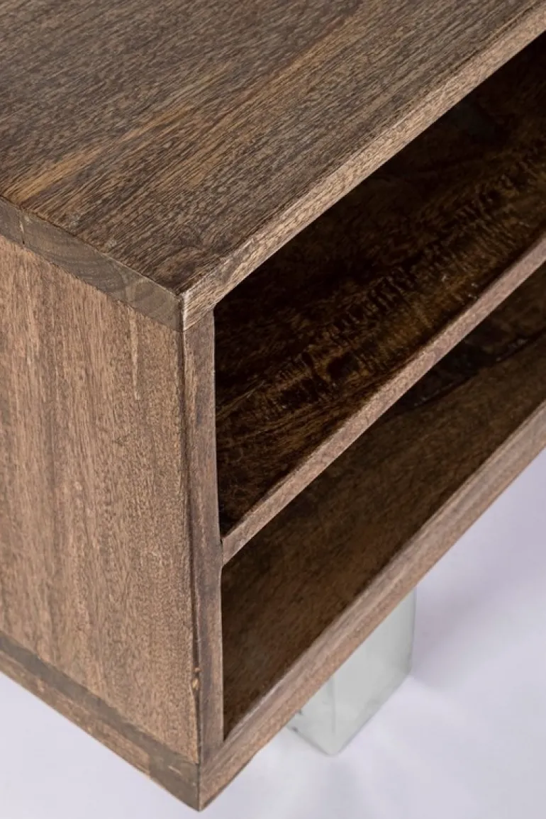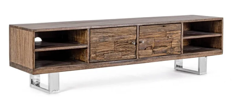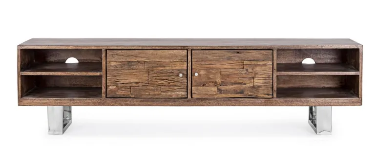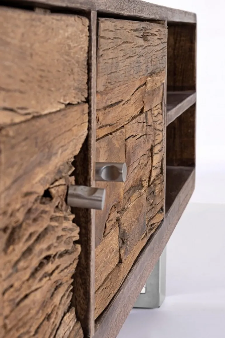 STRUTTURA IN LEGNO DI MANGO, FRONTALI IN LEGNO RICICLATO, SCHIENALI IN COMPENSATO. FINITURA A BASE DI NITROCELLULOSA. GAMBE IN ACCIAIO INOSSIDABILE. IL PRODOTTO IN LEGNO RICICLATO È CARATTERIZZATO DALLA PRESENZA DI TASSELLI IN LEGNO DI DIVERSE SPECIE E COLORE. EVENTUALI FESSURE, CREPE O IMPERFEZIONI, CHE POSSONO GENERARSI ANCHE NEL CORSO DEL TEMPO,