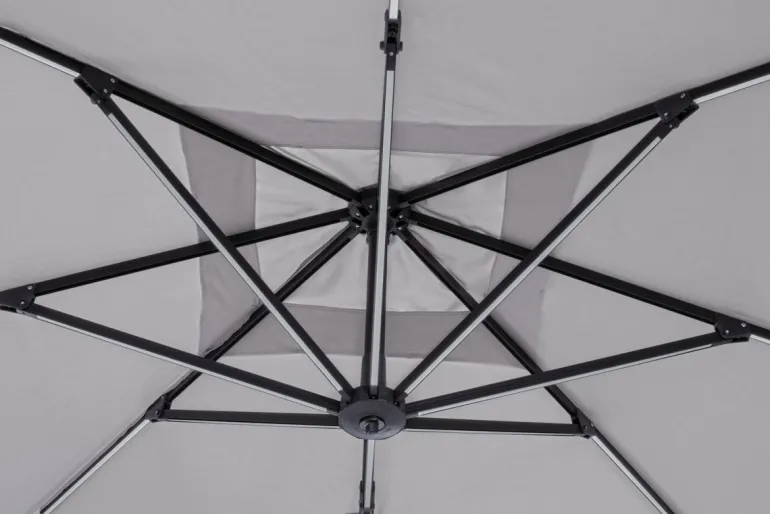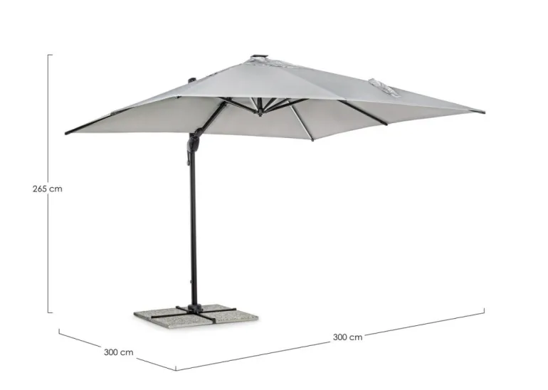 STRUTTURA IN ALLUMINIO VERNICIATA A POLVERE (POLIESTERE). PALO 77X53MM. 8 STECCHE 24x14MM CON LUCI A LED BIANCHE RICARICABILI CON PANNELLO SOLARE INCLUSO. TELO GRIGIO CHIARO IN POLIESTERE 250GR/M2 CON RIVESTIMENTO IN PA (POLIAMMIDE) CON CAMINO ANTIVENTO. BASE A CROCE IN ACCIAIO. PALO GIREVOLE 360° CON PEDALINA. INCLINAZIONE VERTICALE CON IMPUGNATURA A 4 POSIZIONI.