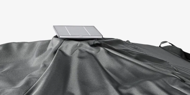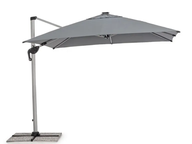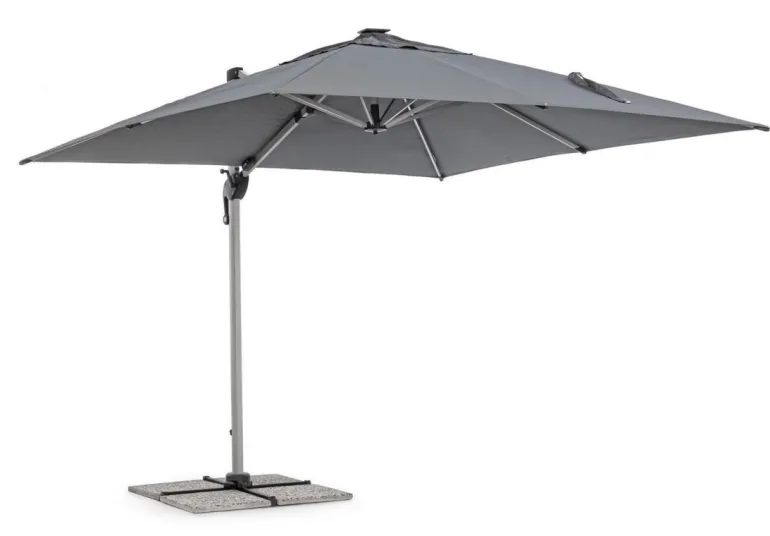 STRUTTURA IN ALLUMINIO ANODIZZATO. PALO 77X53MM. 8 STECCHE 24X14MM CON LUCI A LED BIANCHE RICARICABILI CON PANNELLO SOLARE INCLUSO. TELO GRIGIO SCURO IN POLIESTERE 250GR/M2 CON RIVESTIMENTO IN PA (POLIAMMIDE) CON CAMINO ANTIVENTO. BASE A CROCE IN ACCIAIO. PALO GIREVOLE 360° CON PEDALINA. INCLINAZIONE VERTICALE CON IMPUGNATURA A 4 POSIZIONI. COMPRENSIVO DI COPRIOMBRELLONE. MARMETTE