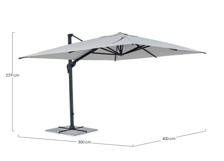 STRUTTURA IN ALLUMINIO VERNICIATA A POLVERE (POLIESTERE). PALO 93X57MM. 8 STECCHE 28X18MM. TELO GRIGIO CHIARO IN POLIESTERE 250GR/M2 CON RIVESTIMENTO IN PA (POLIAMMIDE) CON CAMINO ANTIVENTO. BASE A CROCE IN ACCIAIO. PALO GIREVOLE 360° CON PEDALINA. INCLINAZIONE VERTICALE CON IMPUGNATURA A 4 POSIZIONI. DOTATO DI MANIGLIA PER INCLINAZIONE OMBRELLO DESTRA-SINISTRA. COMPRENSIVO DI