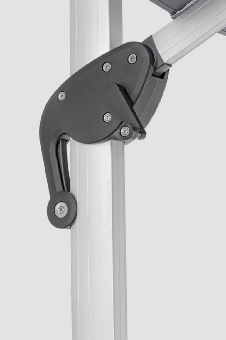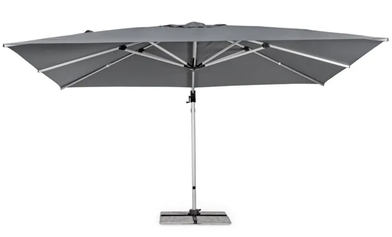 STRUTTURA IN ALLUMINIO ANODIZZATO. PALO 93X57MM. 8 STECCHE 28X18MM. TELO GRIGIO SCURO IN POLIESTERE 250GR/M2 CON RIVESTIMENTO IN PA (POLIAMMIDE) CON CAMINO ANTIVENTO. BASE A CROCE IN ACCIAIO. PALO GIREVOLE 360° CON PEDALINA. INCLINAZIONE VERTICALE CON IMPUGNATURA A 4 POSIZIONI. COMPRENSIVO DI COPRIOMBRELLONE. MARMETTE NON INCLUSE. PREDISPOSIZIONE LAMPADA LED