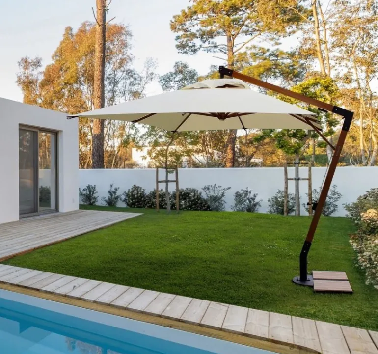 STRUTTURA IN LEGNO VERNICIATO COLOR TEAK A BASE DI NITROCELLULOSA. PALO 93X93 MM, 8 STECCHE 20X35 MM, CON FINALI IN ALLUMINIO E INSERTI IN PELLE. CORONA IN LEGNO. BASE LATERALE IN ACCIAIO. PALO GIREVOLE MANUALMENTE 180°. TELO IN POLIESTERE 270GR/M2 COLORE ECRU’ CON RIVESTIMENTO IN PA (POLIAMMIDE) CON CAMINO ANTIVENTO. MARMETTE NON INCLUSE. SI RACCOMANDA L’USO DI ALMENO 4 MARMETTE