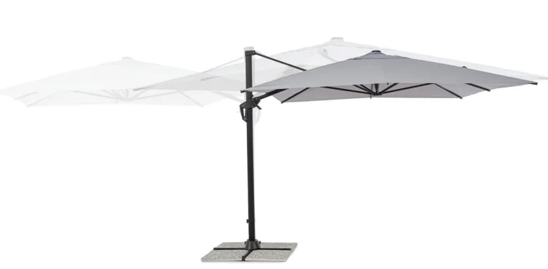 STRUTTURA IN ALLUMINIO VERNICIATA A POLVERE (POLIESTERE). PALO 55X82MM. 8 STECCHE 14.5X24MM. TELO GRIGIO CHIARO IN POLIESTERE 250GR/M2 CON RIVESTIMENTO IN PA (POLIAMMIDE) CON CAMINO ANTIVENTO. BASE A CROCE IN ACCIAIO. PALO GIREVOLE 360° CON PEDALINA. INCLINAZIONE VERTICALE CON IMPUGNATURA A 5 POSIZIONI. COMPRENSIVO DI COPRIOMBRELLONE. MARMETTE NON INCLUSE.