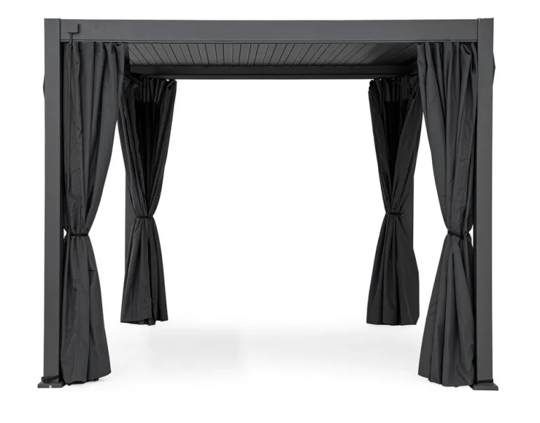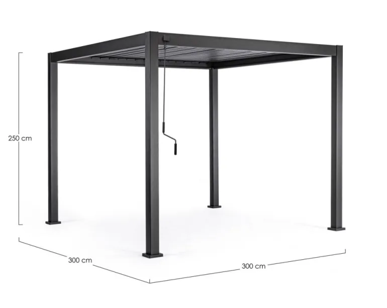 ALLUMINIO VERNICIATO A POLVERE (POLIESTERE). PALI PORTANTI 111X111MM, TRAVERSI 140X75MM. TETTO LAMELLARE ORIENTABILE TRAMITE MANOVELLA. LAME FRANGISOLE A DOPPIO STRATO 173X30MM. SISTEMA DI DEFLUSSO DELL’ACQUA INTEGRATO ALL’INTERNO DEI PALI PORTANTI. VITERIA IN ACCIAIO INOSSIDABILE. DA ASSEMBLARE.