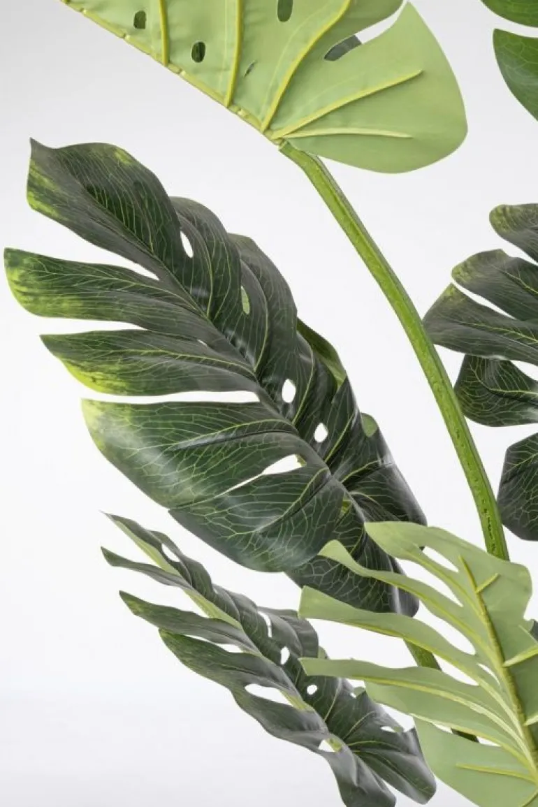 FOGLIE IN GOMMA, TRONCO IN POLIURETANO, METALLO, VASO IN PLASTICA, CONTENUTO VASO IN CEMENTO PER GARANTIRE STABILITA’.