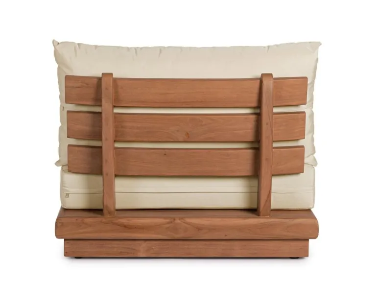 STRUTTURA IN IN TEAK – SVLK (LEGNO CERTIFICATO PROVENIENTE DA FORESTE SOSTENIBILI), FINITURA FINALE A BASE D’ACQUA. CUSCINI SFODERABILI IN TESSUTO IDROREPELLENTE SUNPROOF OLEFIN (100%POLYPROPYLENE). IL TEAK È UN LEGNO RICCO DI OLII. CON IL PASSARE DEL TEMPO, QUESTI OLII, PER UN PROCESSO NATURALE, RISALGONO IN SUPERFICIE E POSSONO MACCHIARE EVENTUALI CUSCINI A DIRETTO CONTATTO CON IL LEGNO.