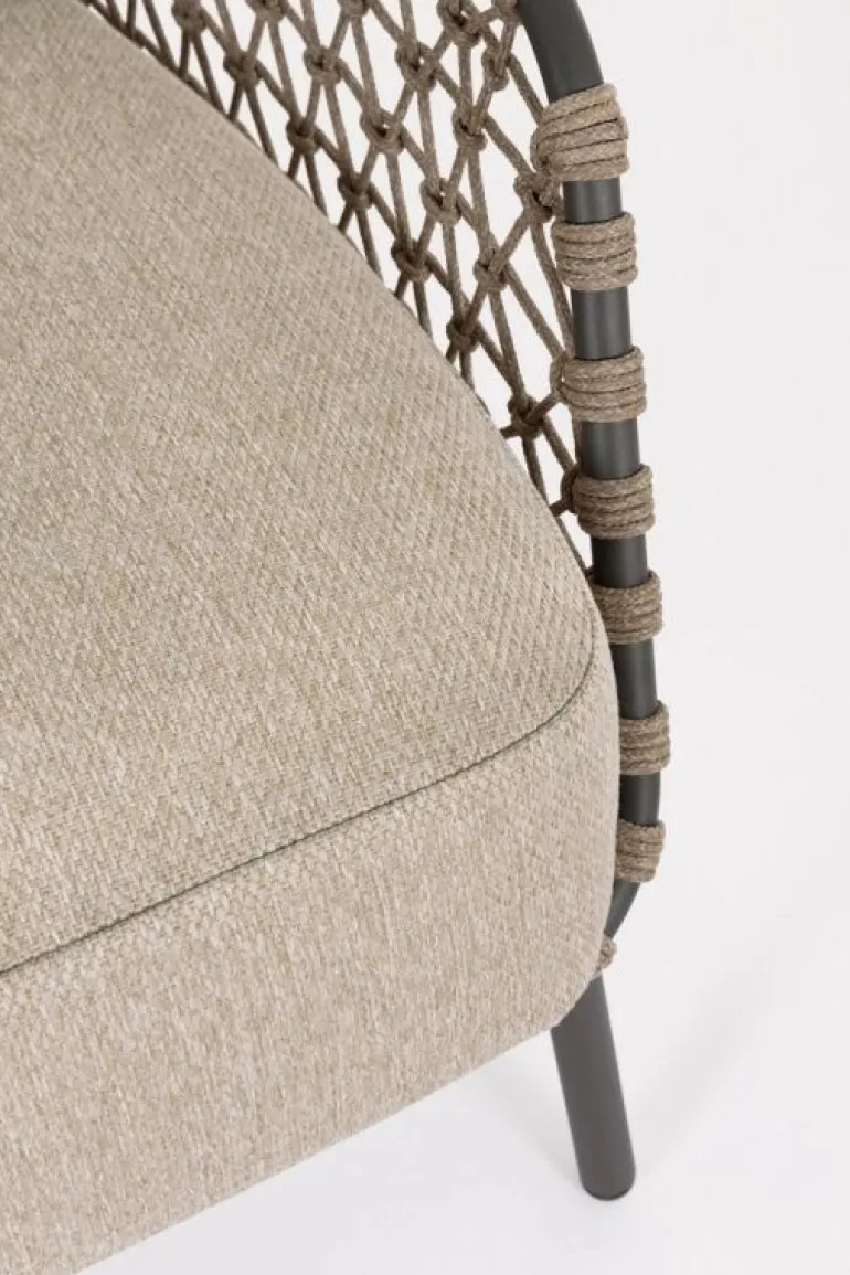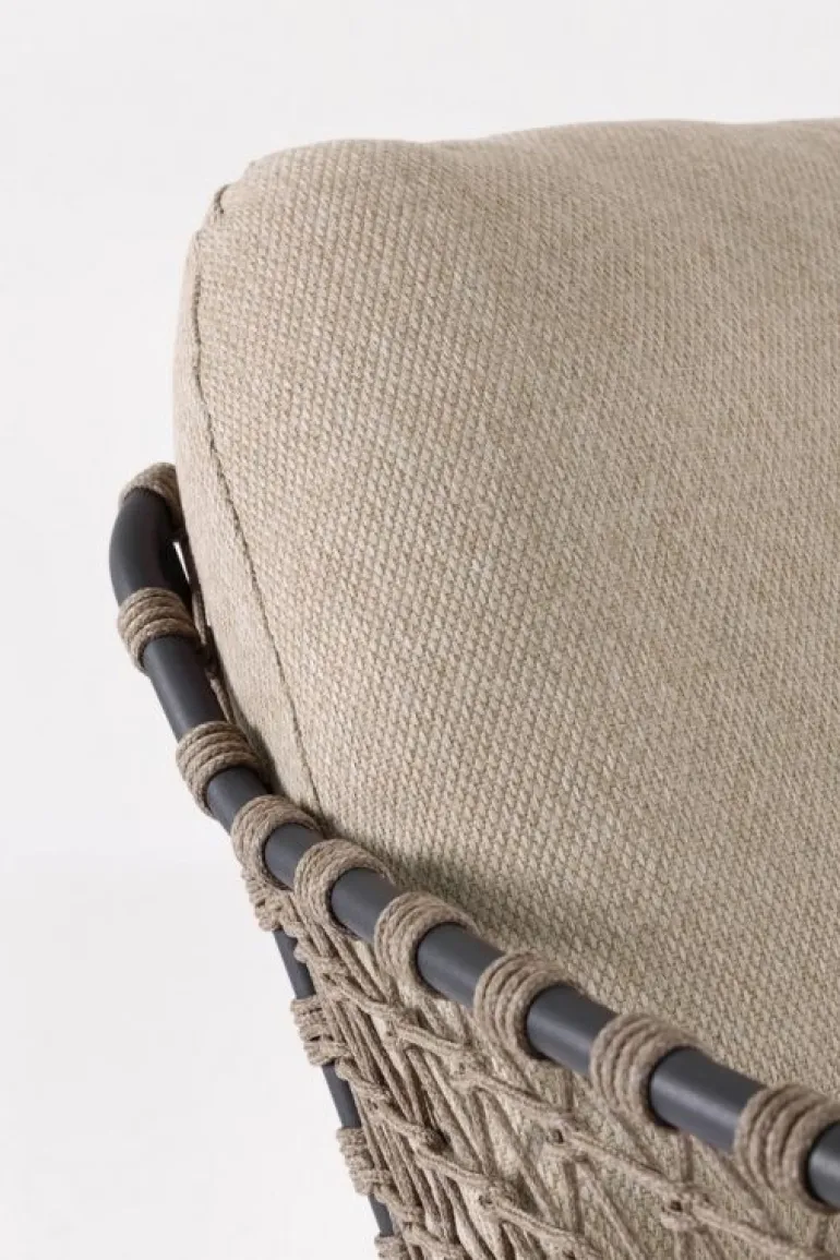 STRUTTURA IN ACCIAIO INOSSIDABILE (201). INTRECCIO PER ESTERNO IN CORDA (POLIPROPILENE). CUSCINI SFODERABILI IN TESSUTO IDROREPELLENTE SUNPROOF OLEFIN (100%POLYPROPYLENE).