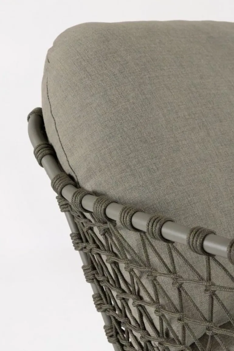 STRUTTURA IN ACCIAIO INOSSIDABILE (201). INTRECCIO PER ESTERNO IN CORDA (POLIPROPILENE). CUSCINI SFODERABILI IN TESSUTO IDROREPELLENTE SUNPROOF OLEFIN (100%POLYPROPYLENE).