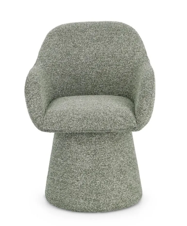 STRUTTURA IN ACCIAIO E COMPENSATO. RIVESTIMENTO IN 100% POLIESTERE EFFETTO BOUCLE. IMBOTTITURA IN SCHIUMA POLIURETANICA DENSITA’ SEDUTA 28KG/M3 SCHIENALE 24KG/M3. GIREVOLE 360°