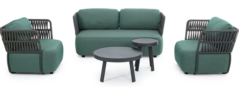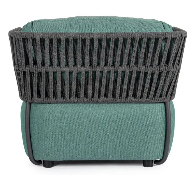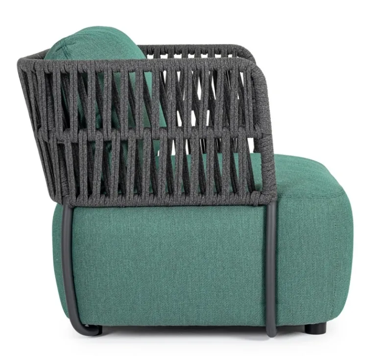 STRUTTURA IN ALLUMINIO VERNICIATO A POLVERE (POLIESTERE). INTRECCIO IN CORDA OLEFIN (100% POLIPROPILENE). SEDUTA CON IMBOTTITURA IMPERMEABILE, RIVESTIMENTO NON SFODERABILE IN TESSUTO PER ESTERNO IN OLEFIN (100% POLIPROPILENE, 285G/M2),IDROREPELLENTE E RESISTENTE AI RAGGI UV (GRADO 7). CUSCINO SCHIENALE SFODERABILE IN TESSUTO OLEFIN.