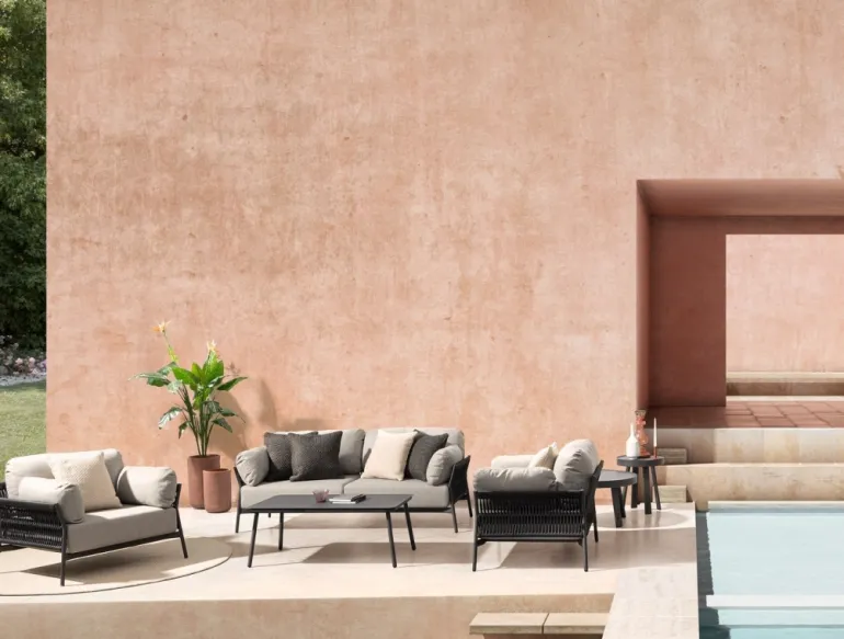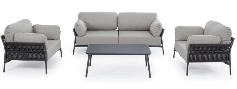 STRUTTURA IN ALLUMINIO VERNICIATO A POLVERE (POLIESTERE). INTRECCIO IN CORDA OLEFIN (100% POLIPROPILENE). CUSCINI SEDUTA E SCHIENALE SFODERABILI IN TESSUTO IDROREPELLENTE OLEFIN (100% POLIPROPILENE).