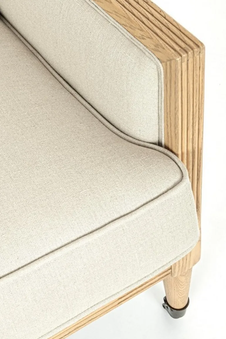STRUTTURA IN LEGNO DI FRASSINO, RIVESTIMENTO 100% LINO. DENSITA’ IMBOTTITURA IN SCHIUMA POLIURETANICA SEDUTA 30KG/M3, SCHIENALE 25KG/M3.CUSCINI SFODERABILI. COMPRENSIVO DI RUOTE ANTERIORI IN ACCIAIO ZINCATO.