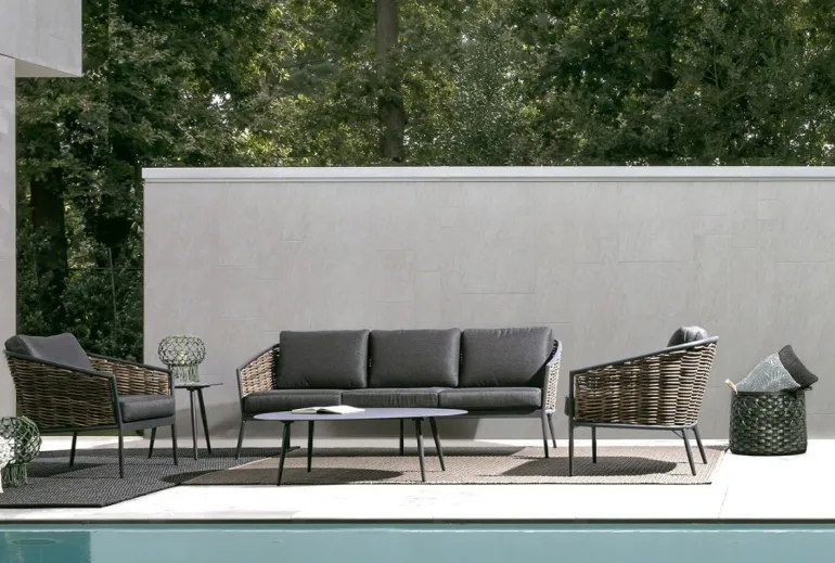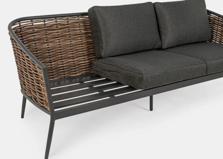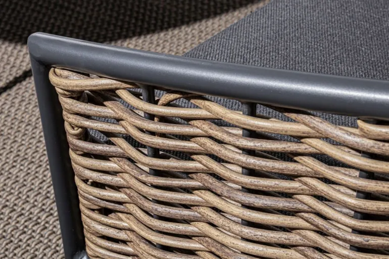 STRUTTURA IN ALLUMINIO VERNICIATA A POLVERE (POLIESTERE). INTRECCIO IN FIBRA SINTETICA (TONDA 9MM). CUSCINI SEDUTA E SCHIENALE SFODERABILI CON TESSUTO IDROREPELLENTE OLEFIN (100% POLIPROPILENE).