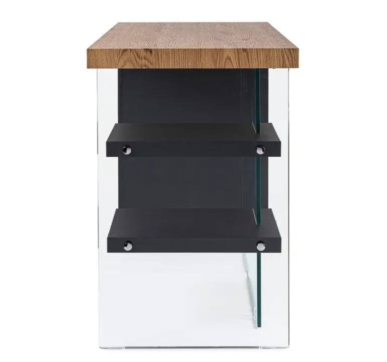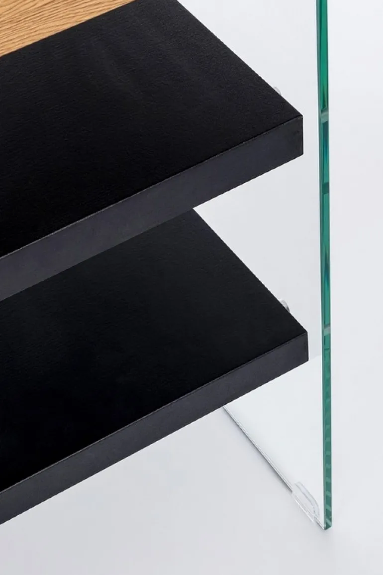 PIANO, MENSOLE E FIANCO SINISTRO IN MDF RIVESTITO CON CARTA MELAMINICA EFFETTO LEGNO. SCHIENA E FIANCO DX IN VETRO TEMPERATO SPESSORE 10MM. PORTATA MAX MENSOLE 2KG. DA ASSEMBLARE.
