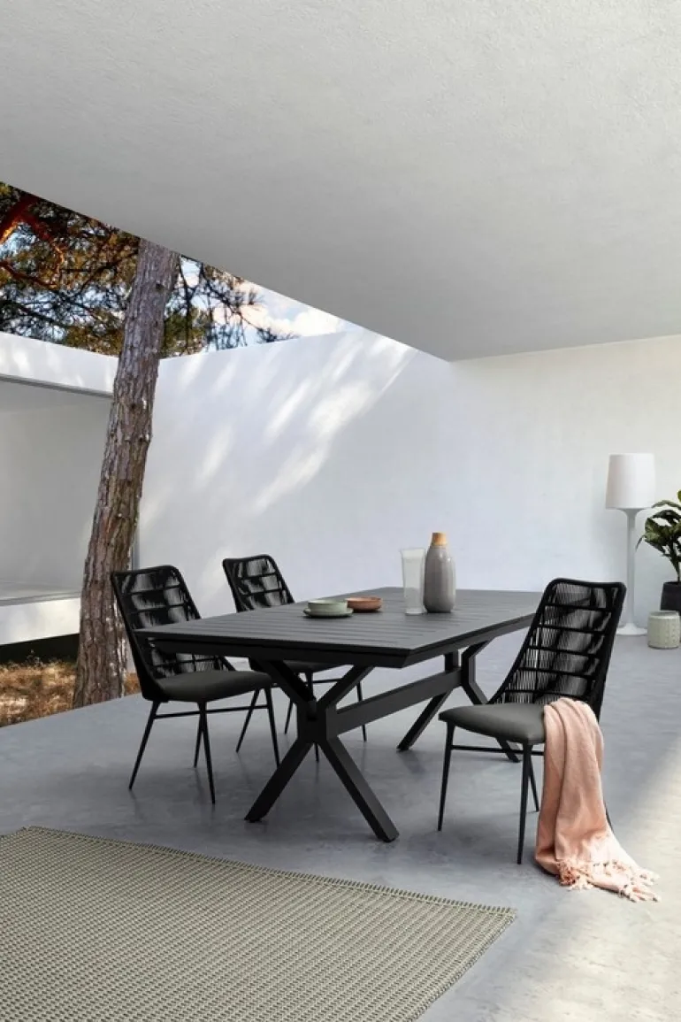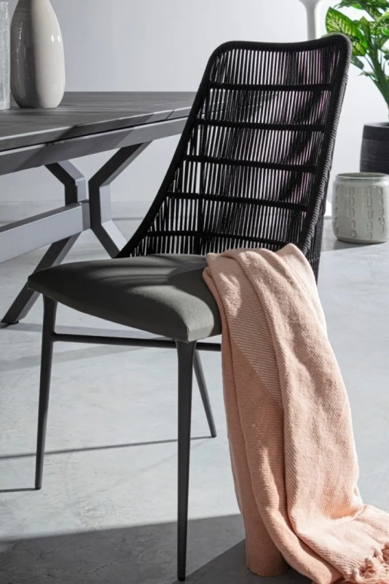 STRUTTURA IN ALLUMINIO (FUSIONE) VERNICIATO A POLVERE (POLIESTERE). INTRECCIO PER ESTERNO IN CORDA (POLIPROPILENE), IDROREPELLENTE E RESISTENTE AI RAGGI UV. SEDUTA NON SFODERABILE CON TESSUTO SUNPROOF OLEFIN (100% POLIPROPILENE). IMBOTTITURA PER ESTERNO QUICK DRY FOAM (ANTIUMIDITA’).
