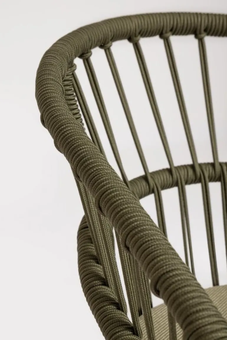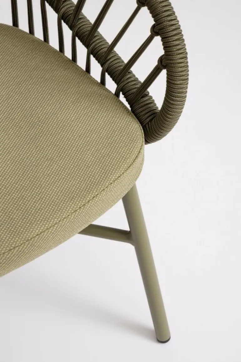 STRUTTURA IN ALLUMINIO VERNICIATA A POLVERE (POLIESTERE). INTRECCIO PER ESTERNO IN CORDA (POLIESTERE). CUSCINI SFODERABILI CON TESSUTO IDROREPELLENTE OLEFIN (100% POLIPROPILENE). IMPILABILE. IMBALLO SENZA CARTONE.