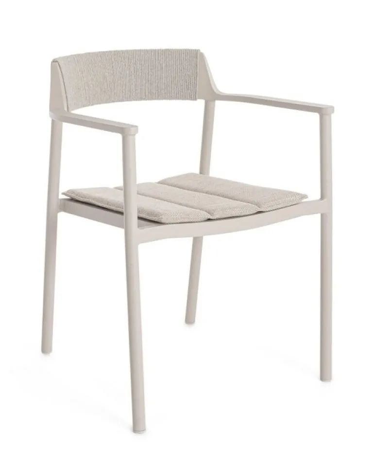 STRUTTURA IN ALLUMINIO VERNICIATO A POLVERE (POLIESTERE). SCHIENALE CON INTRECCIO IN CORDA DI POLIESTERE. CUSCINO SEDUTA SFODERABILE CON TESSUTO IDROREPELLENTE OLEFIN (100% POLIPROPILENE). IMPILABILE.