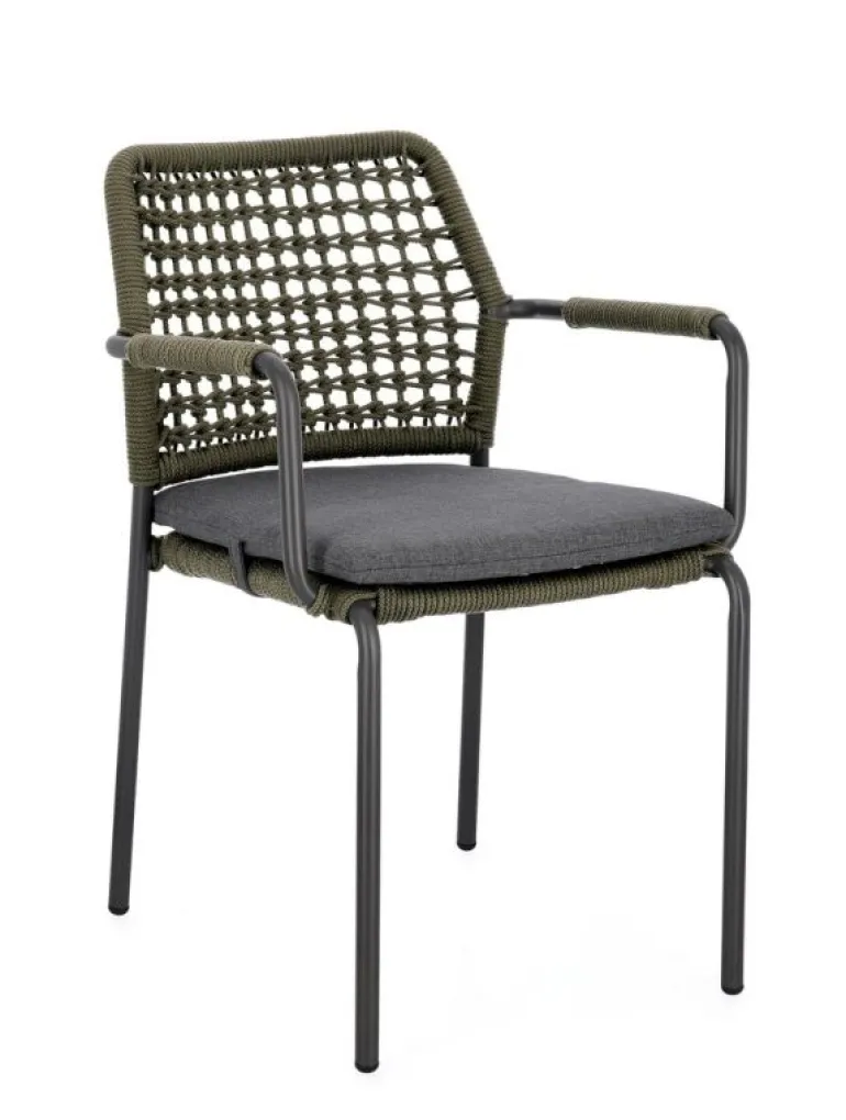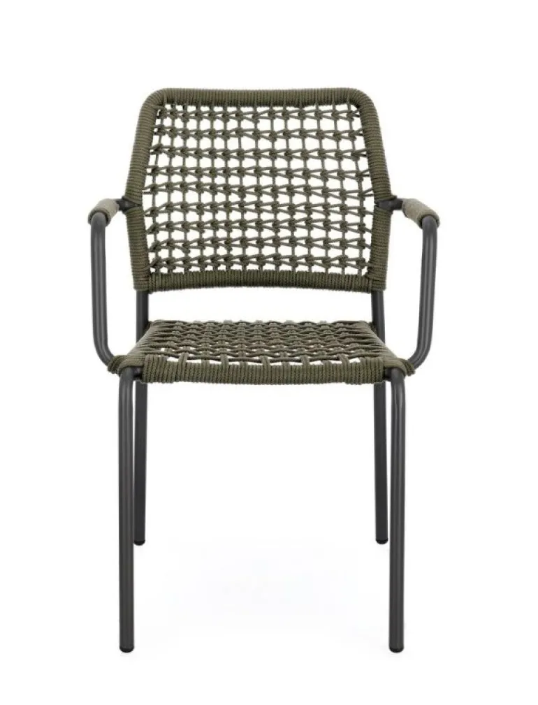 STRUTTURA IN ALLUMINIO VERNICIATA A POLVERE (POLIESTERE). INTRECCIO PER ESTERNO IN CORDA OLEFIN (POLIPROPILENE). IMPILABILE.