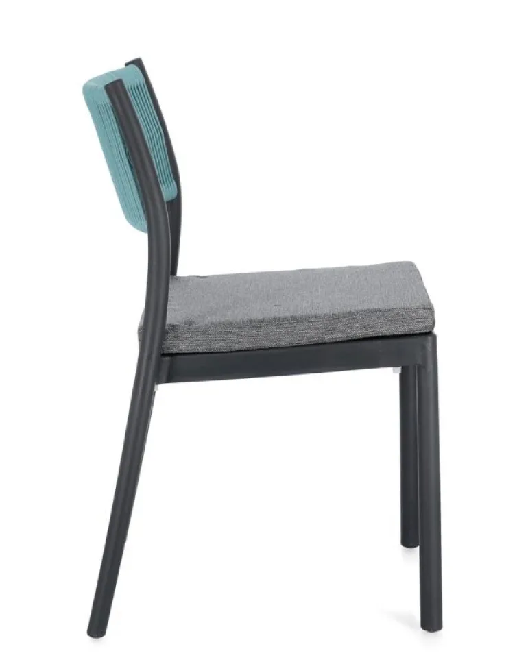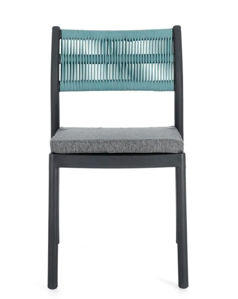 POLIPROPILENE (PP), RESISTENTE AI RAGGI UV. SCHIENALE CON INTRECCIO IN CORDA DI POLIESTERE. CUSCINO SEDUTA SFODERABILE CON TESSUTO IDROREPELLENTE POLIESTERE. IMPILABILE.
