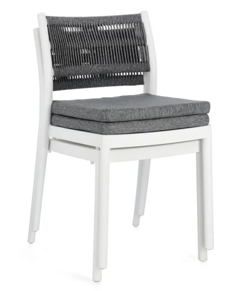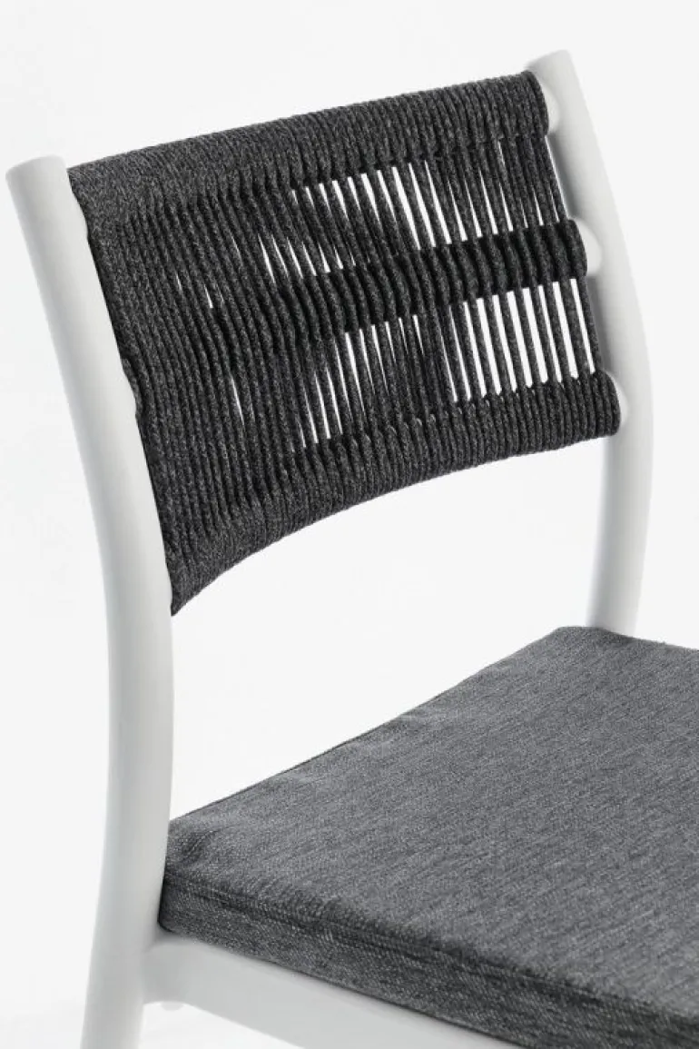 POLIPROPILENE (PP), RESISTENTE AI RAGGI UV. SCHIENALE CON INTRECCIO IN CORDA DI POLIESTERE. CUSCINO SEDUTA SFODERABILE CON TESSUTO IDROREPELLENTE POLIESTERE. IMPILABILE.