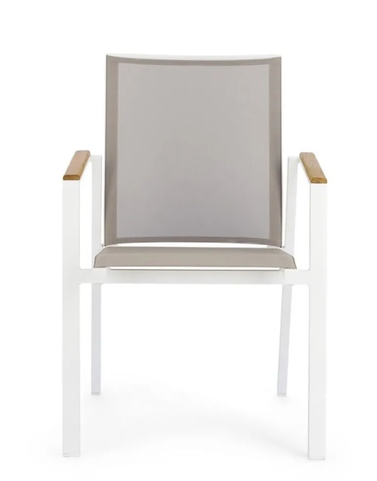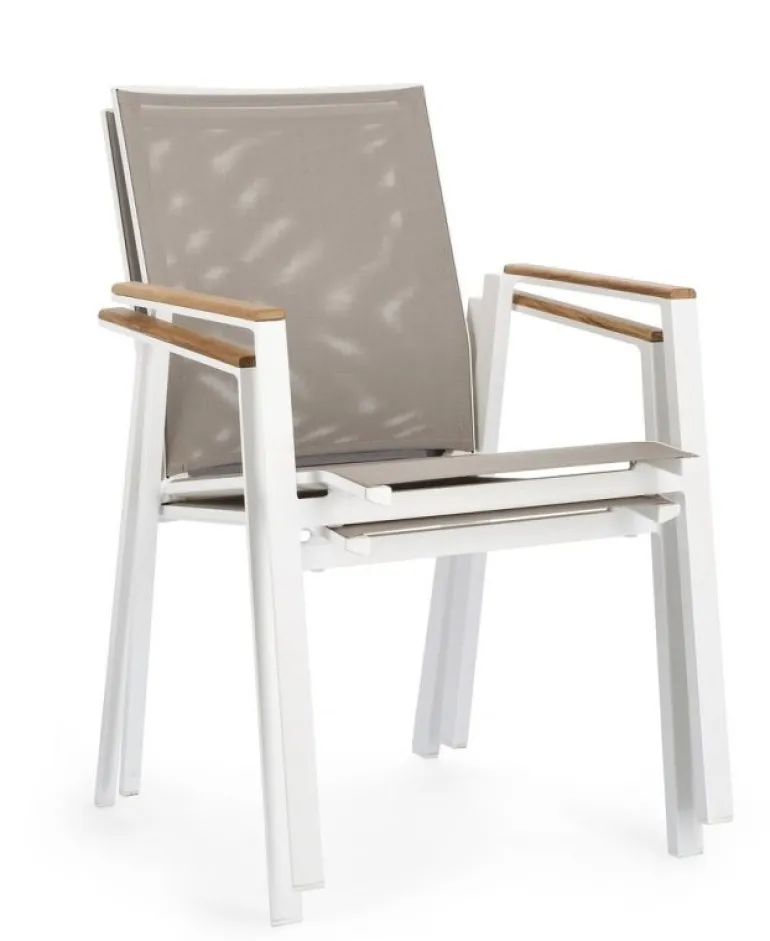 STRUTTURA IN ALLUMINIO, VERNICIATO A POLVERE (POLIESTERE). BRACCIOLI CON INSERTI IN TEAK. SEDUTA E SCHIENALE RIVESTITI IN TEXTILENE PHIFER 1X1. IMPILABILE.