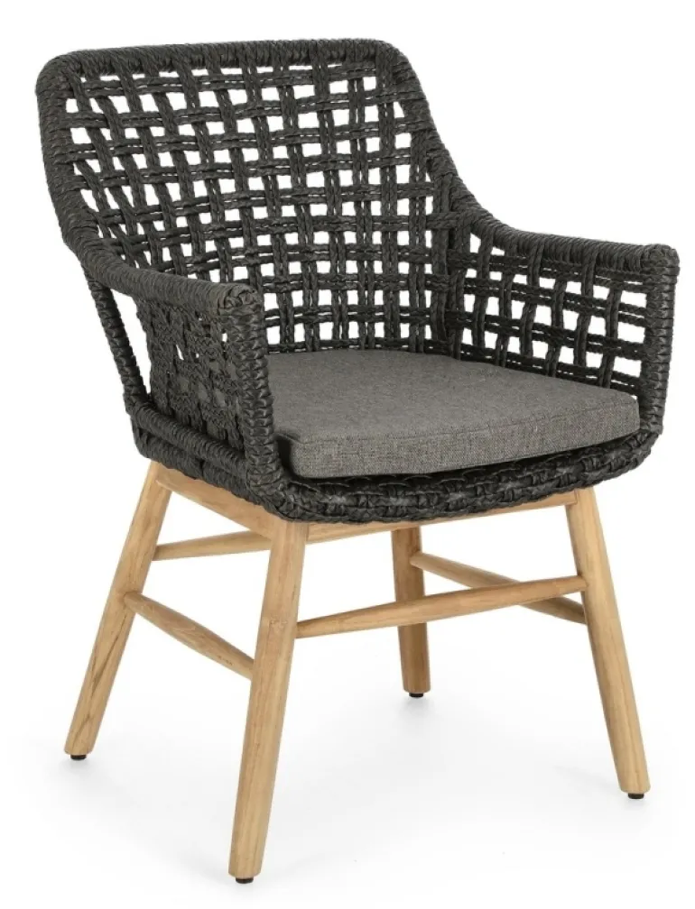 SEDUTA CON STRUTTURA IN ALLUMINIO VERNICIATA A POLVERE (POLIESTERE). INTRECCIO IN FIBRA SINTETICA VIRO CON ORIGINALE PIEGATURA A TRECCIA (EFFETTO PELLE). CUSCINO SEDUTA SFODERABILE IN TESSUTO SUNPROOF OLEFIN (100% POLIPROPILENE). GAMBE IN TEAK – SVLK (LEGNO CERTIFICATO PROVENIENTE DA FORESTE SOSTENIBILI). VITERIA IN ACCIAIO GALVANIZZATO. GAMBE DA ASSEMBLARE