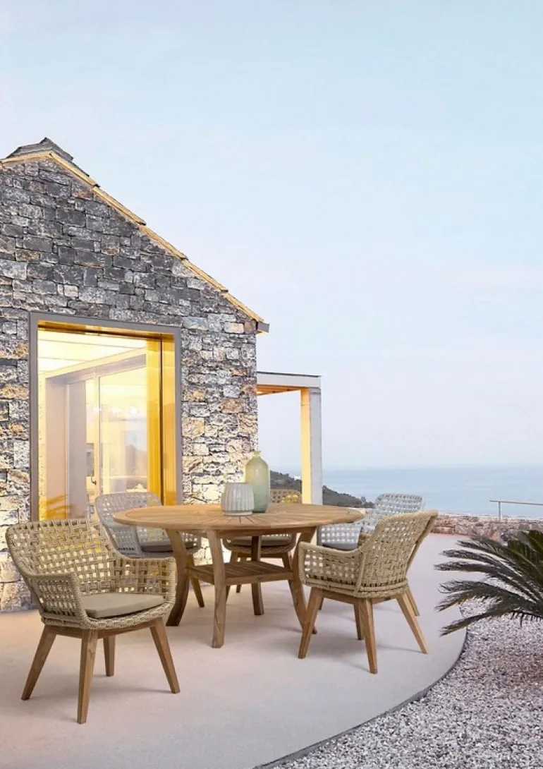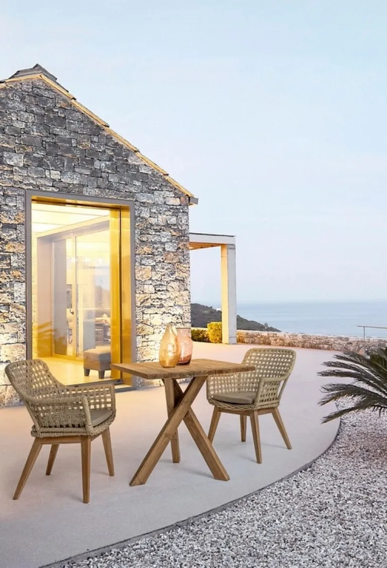 SEDUTA CON STRUTTURA IN ALLUMINIO VERNICIATA A POLVERE (POLIESTERE). INTRECCIO IN FIBRA SINTETICA VIRO CON ORIGINALE PIEGATURA A TRECCIA (EFFETTO PELLE). CUSCINO SEDUTA SFODERABILE IN TESSUTO IDROREPELLENTE SUNPROOF OLEFIN (100% POLIPROPILENE). GAMBE IN TEAK – SVLK (LEGNO CERTIFICATO PROVENIENTE DA FORESTE SOSTENIBILI). VITERIA IN ACCIAIO GALVANIZZATO. GAMBE DA ASSEMBLARE. ATTENZIONE: PRIMA DI PROCEDERE AL MONTAGGIO, ASSICURARSI CHE LA NUMERAZIONE SEDUTA-GAMBE COINCIDA.