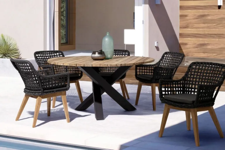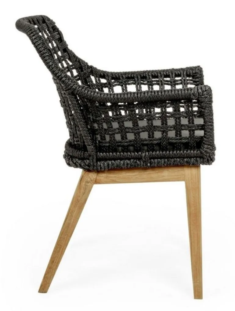 SEDUTA CON STRUTTURA IN ALLUMINIO VERNICIATA A POLVERE (POLIESTERE). INTRECCIO IN FIBRA SINTETICA VIRO CON ORIGINALE PIEGATURA A TRECCIA (EFFETTO PELLE). CUSCINO SEDUTA SFODERABILE IN TESSUTO IDROREPELLENTE SUNPROOF OLEFIN (100% POLIPROPILENE). GAMBE IN TEAK – SVLK (LEGNO CERTIFICATO PROVENIENTE DA FORESTE SOSTENIBILI). VITERIA IN ACCIAIO GALVANIZZATO. GAMBE DA ASSEMBLARE. ATTENZIONE: PRIMA DI PROCEDERE AL MONTAGGIO, ASSICURARSI CHE LA NUMERAZIONE SEDUTA-GAMBE COINCIDA.