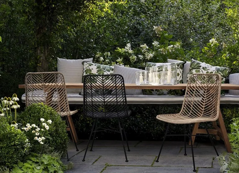 STRUTTURA IN ACCIAIO VERNICIATO A POLVERE EPOSSIDICA. INTRECCIO IN RATTAN. SI RACCOMANDA DI NON ESPORRE L’ARTICOLO ALLA LUCE DIRETTA DEL SOLE ED ALLE INTEMPERIE. IMBALLO SENZA CARTONE.